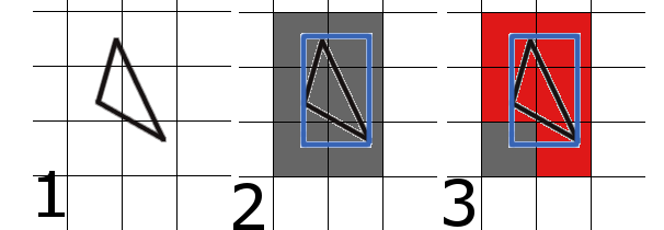 triangles (1) the triangle in the grid. (2) the triangle with its AABB and the AABCs intersected by the AABB. (3) the AABCs intersected by the triangle